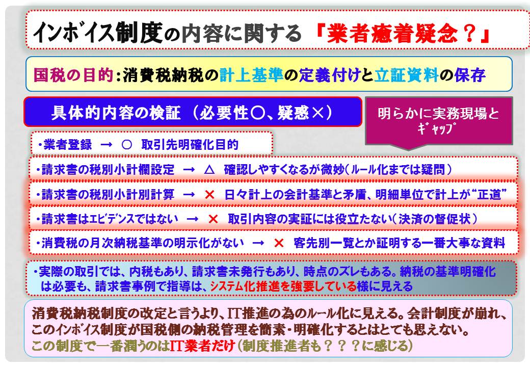 | ・ ・内容が帳票中心の解説(従来の申告基準表現と違いアリ)詳細:上記インボイス制度矛盾を参照 | ・ ・納税定義が実質無い・不明確(業務とギャップ)・・・会計制度と矛盾など(決算整理仕訳・客先管理の問題等)実質作業負担増 | ・ ※今回のインボイス制度は会計と連動した納税定義・ルール化とは言い難い。限りなく疑惑ある制度とも想定できる(下段に概要) | ■制度改定の目的や実務的な影響 | ・@消費税の抜け穴(欠陥)の解消 ・・ 売上消費税ー仕入消費税を納付する現制度の欠陥をカバー | ・ ・売り側と買い側の取引の差が納税されないリスクを解消している。(業者登録と仕入消費税の控除内容表示)。 | ・A取引内容の明確化で、債権債務管理ではない。其の為のエビデンスや請求書の表示基準を決めただけ。